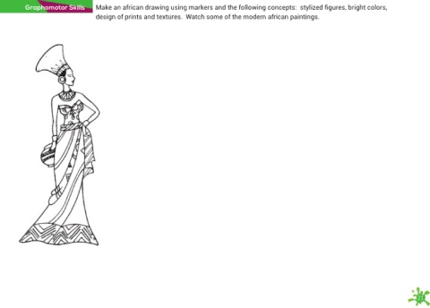 Graphomotor Skills Make an african drawing using markers and the following concepts: stylized figures, bright colors, design of prints and textures. Watch some of the modern african paintings. 21