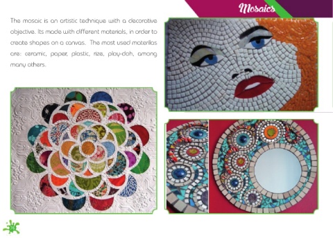Mosaics The mosaic is an artistic technique with a decorative objective. Its made with different materials, in order to create shapes on a canvas. The most used materilas are: ceramic, paper, plastic, rize, play-doh, among many others. 76