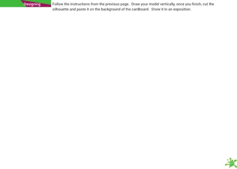 Designing Follow the instructions from the previous page. Draw your model vertically, once you finish, cut the silhouette and paste it on the background of the cardboard. Show it in an exposition. 107