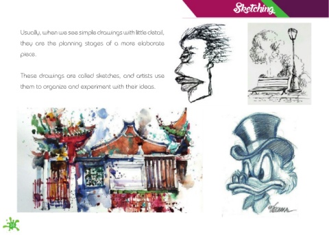 Sketching Usually, when we see simple drawings with little detail, they are the planning stages of a more elaborate piece. These drawings are called sketches, and artists use them to organize and experiment with their ideas. 16