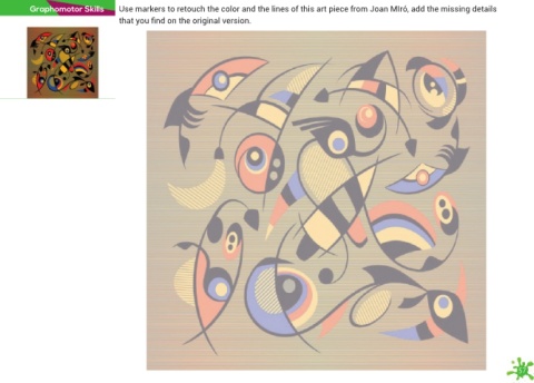 Graphomotor Skills Use markers to retouch the color and the lines of this art piece from Joan MIró, add the missing details that you find on the original version. 57